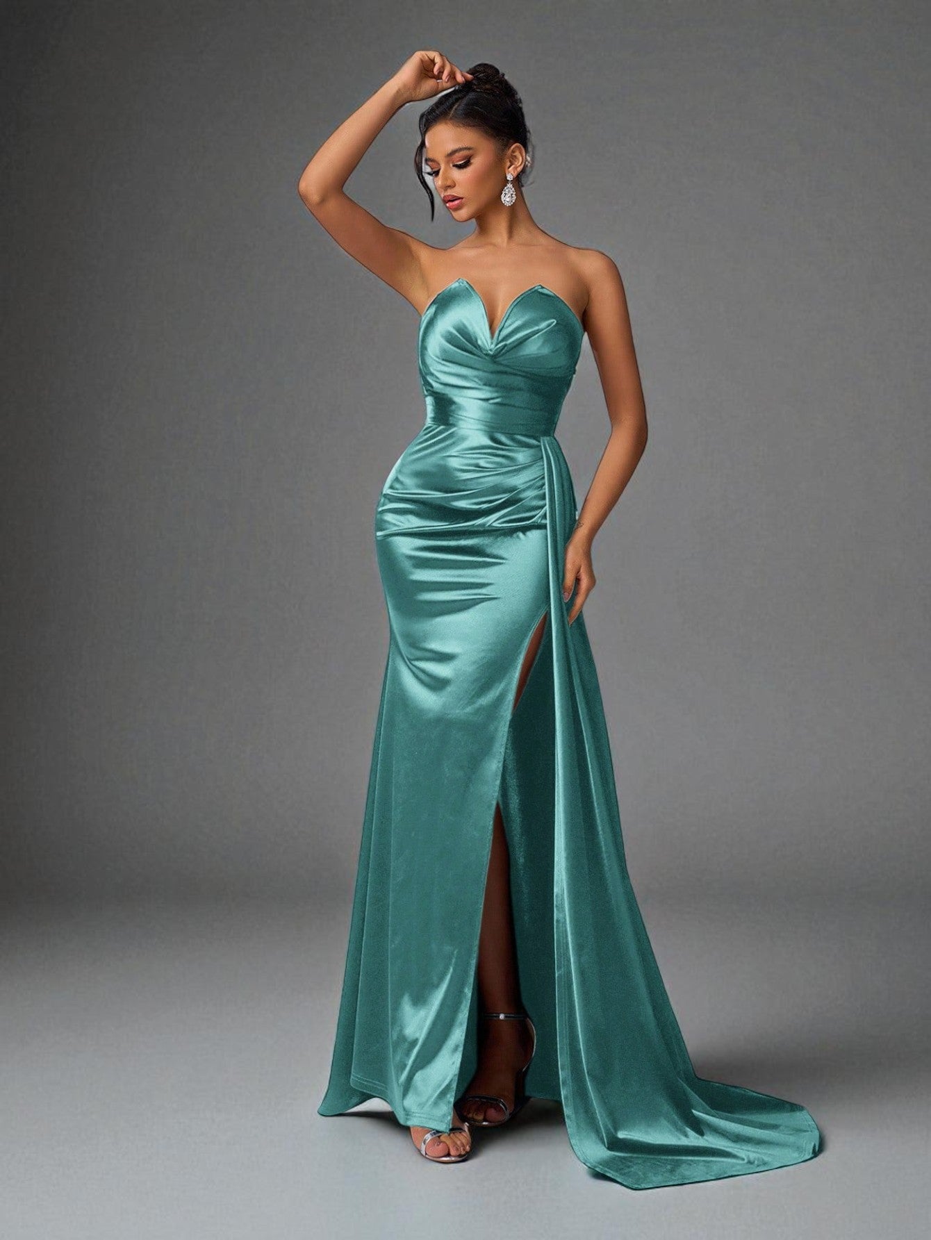 Confeccionado em cetim de alto brilho, o modelo valoriza as curvas com seu caimento impecável e o drapeado elegante na cintura, que realça a silhueta.