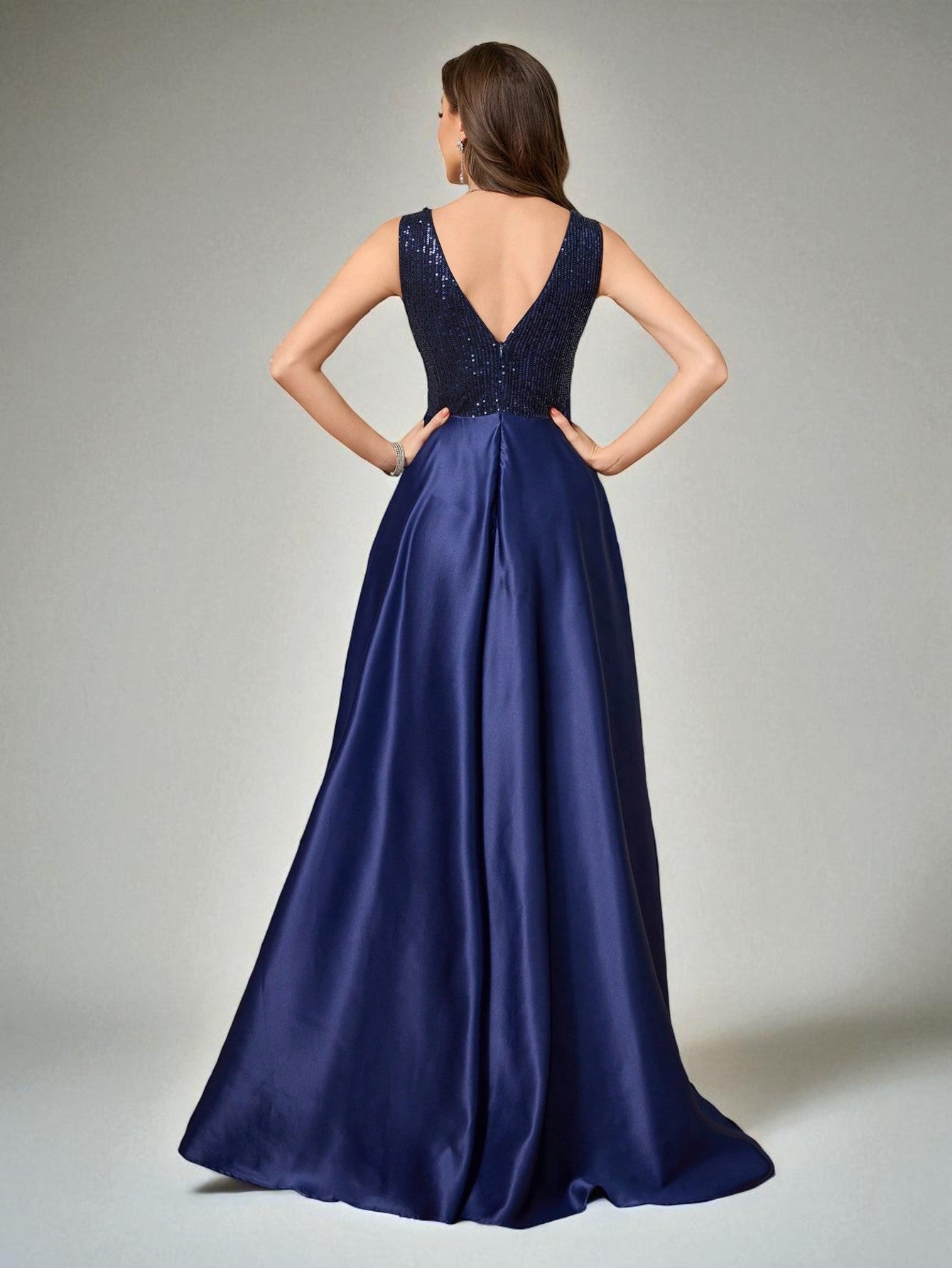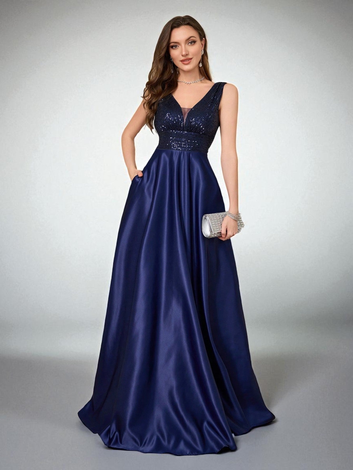 • Vestido de Festa Azul Marinho Vestido de Festa Longo com Bolso Lateral Paetê Leonor