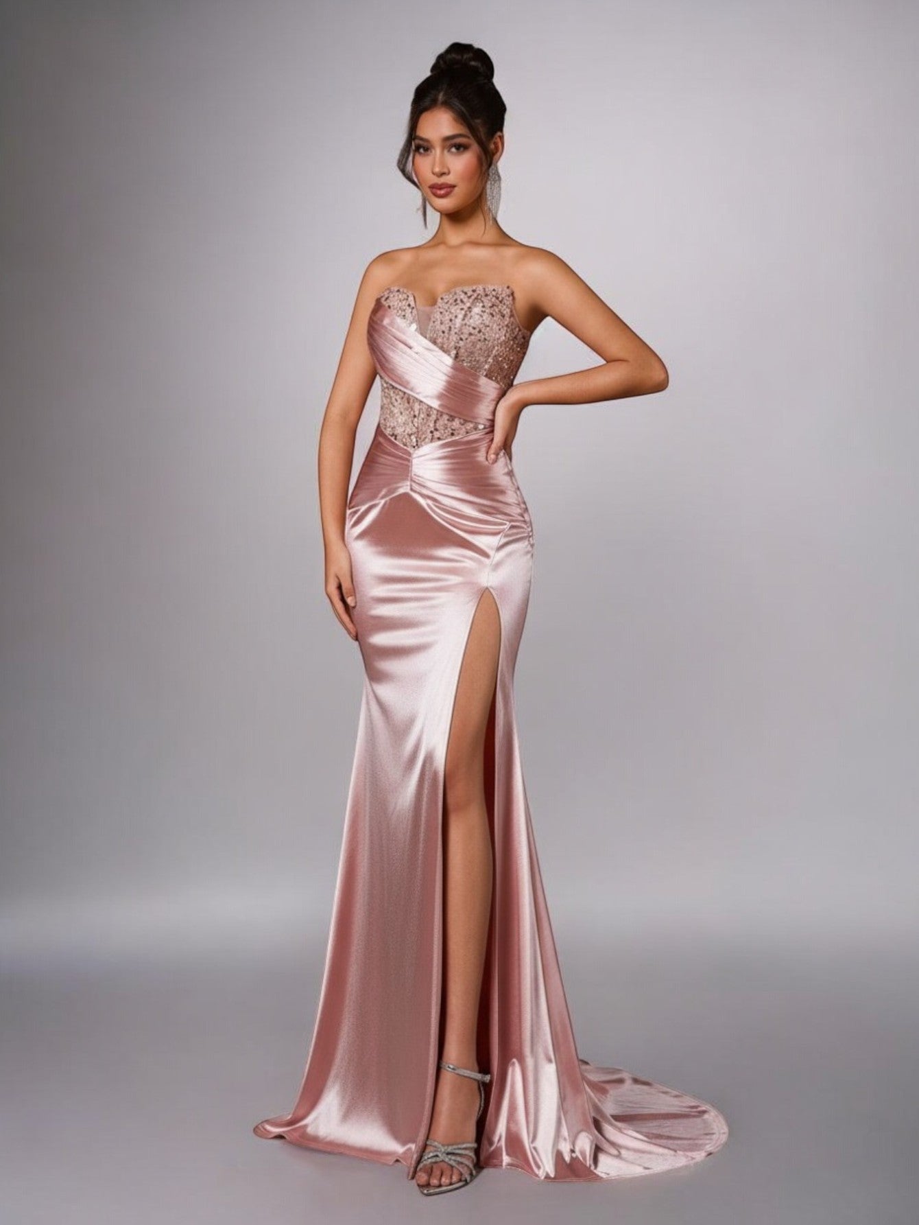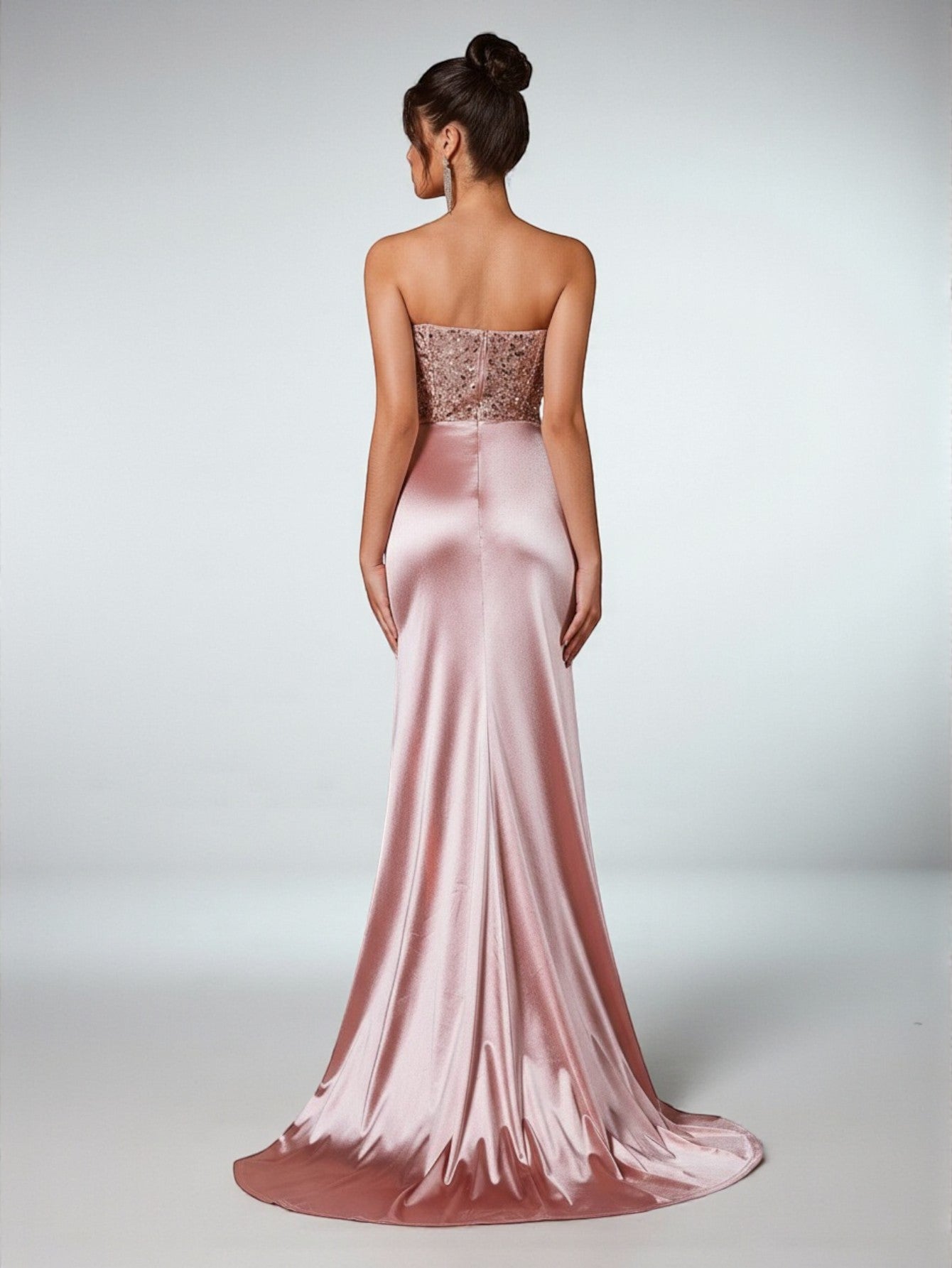 Com modelagem tomara que caia e corpo bordado em paetês delicados, o modelo é realçado por faixas acetinadas cruzadas que desenham a cintura e valorizam a silhueta.